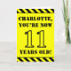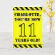 The front of this attention-grabbing and bold birthday themed greeting card design features an editable name and the message "YOU’RE NOW 11 YEARS OLD!" in black stencil style text on a yellow colored background. There is also an eye-catching yellow and black stripes pattern at the top and bottom edges of the front. The inside features a customized birthday greeting message, or could perhaps be cleared and left blank if a message is to be written by hand instead. A personalized birthday card like this might be a fun way to send a message in celebration of somebody’s eleventh birthday. [~Z0000413]