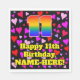 This fun and colourful birthday paper napkin design features a large number “11” having a rainbow spectrum gradient inspired pattern. It also features the message “Happy 11th Birthday,”, and an editable name. The background features a pattern of purple, red, and pink heart shapes. Upbeat, friendly paper napkins like this might be fun to use at a birthday party/celebration being held in celebration of somebody’s 11th birthday. [~Z0000550]