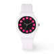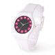 A stylish clock face with the numbers placed inside circular colour spots in each hour position. Also available in other colours.