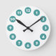 A stylish clock face with the numbers placed inside circular color spots in each hour position. Also available in other colors.