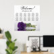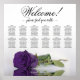 This wedding seating chart has 12 tables and boasts a romantic, elegant, and beautiful design. A modern floral arrangement is accented by a single, long-stemmed deep royal purple rose lying on its side, reflecting in a pool of water. The title, "Welcome! please find your table," is written in fancy script calligraphy, while the names of the couple and the wedding date are displayed at the bottom. With table assignments for 120 guests and 10 seats per table, this chart provides ample seating arrangements for your guests to enjoy the celebration.