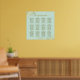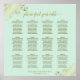 This 12 table wedding seating chart is both simple and elegant. It includes table assignments for 120 guests with 10 seats per table. The design features gold text on a light green or neo mint colored background with a lacy script calligraphy title. The corners are decorated with a frilly faux foil filigree with curls and swirls. Stylish, chic and sophisticated way to help your guests find their seats at your reception.