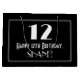 This vintage appearance Roaring '20s look inspired birthday gift bag design features a large art deco look inspired number "12", the message "Happy 12th Birthday,", a personalised name, and a border pattern consisting of thin lines. The background is coloured black. A birthday themed gift bag like this might be used when giving a gift or present in celebration of somebody’s 12th birthday. [~Z0000496]