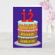 This joyful and cheerful birthday-themed greeting card design features a depiction of a three-tier birthday cake having number-shaped candles on top showing the age “12“, along with the message “HAPPY 12TH BIRTHDAY,”, and a customisable recipient name. The inside has a personalised birthday greeting message, or could perhaps be cleared and left blank if a message is to be written by hand instead. A fun, editable birthday greeting card like this might be used to celebrate somebody’s twelfth birthday. [~Z0000620]