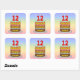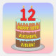 This joyful and cheerful birthday-themed square sticker design features a cartoon-style depiction of a three-tier birthday cake having number-shaped candles on top showing the age “12“, along with the message “HAPPY 12TH BIRTHDAY,”, and an editable recipient name. The background features a multi-colour pastel rainbow spectrum inspired gradient pattern. Upbeat stickers like these might be used or given out at a birthday party held for somebody in celebration of their 12th birthday, or perhaps used when preparing invitations or wrapping gifts/presents for such an event. [~Z0000624]