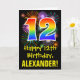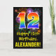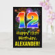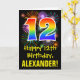 The front of this colorful, fun, and exciting birthday themed greeting card design features a large number "12" having a rainbow spectrum gradient inspired pattern. It also features the message "Happy 12th Birthday,", and a customizable recipient name. The front additionally has a colorful bursting celebratory fireworks inspired background pattern. The inside features an editable birthday greeting message, or could perhaps be cleared and left blank if a message is to be written by hand instead. A customizable birthday card like this might be a fun way to send a message celebrating somebody’s twelfth birthday. [~Z0000442]