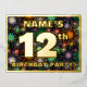 The front of this bold twelfth birthday party/celebration foil invitation postcard design features an editable name, a large number “12th”, the message “BIRTHDAY PARTY!”, and a border. The background of the front features an exciting, multicolored bursting celebratory fireworks-inspired pattern. The back features personalised details about the event, such as the date, time, location, and any other important information. Customisable invitations like these might be a fun way to let guests/attendees know about a birthday party being held to celebrate somebody’s 12th birthday. [~Z0000609]