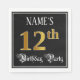 This ornate and opulent birthday themed paper napkin design features a personalised name and the message “12th Birthday Party”. The large number “12th” has an imitation/faux gold-inspired colouring pattern, and the words “Birthday Party” are in elegant script-style text. The background is coloured black by default (although it can be customised). Fancy, elegant paper napkins like this might be useful to have at a birthday party being held to honour somebody’s twelfth birthday. [~Z0000565]
