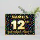 The front of this joyful twelfth birthday celebration/party foil invitation card design features a personalised name, a large number “12th”, the message “BIRTHDAY PARTY!”, and a border. The background of the front has a fun, multicolored pattern of stars. The back features personalised details about the event, such as the date, time, place/venue, and any other relevant information. Editable invitations like these might be a fun way to invite guests/attendees to a birthday party/gathering being held to honour somebody’s 12th birthday. [~Z0000600]