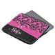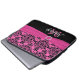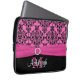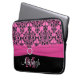 This chic and trendy personalised black, white, and hot pink damask pattern laptop sleeve with a PRINTED ribbon and PRINTED jewel brooch has text boxes for you to customise with your own name, monogram, business name, or other text. ****IF you would like the larger 15" size, please email me to make it up, as selecting the larger or smaller size will cause the design and text to shift. If you need any help customising, please email niteowlstudio@gmail.com.