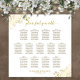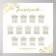This beautiful 13 table wedding seating chart includes table assignments for 130 guests with 10 seats per table. The design features gold text on a white background with a lacy script calligraphy title. The corners are decorated with a frilly faux foil filigree with curls and swirls making it both simple and elegant. Stylish, chic and sophisticated way to help your guests find their seats at your reception.