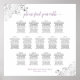 This beautiful 13 table wedding seating chart includes table assignments for 130 guests with 10 seats per table. The design features dark gray and light purple or lavender text on a white background with a lacy script calligraphy title. The corners are decorated with a frilly faux foil silver filigree with curls and swirls making it both simple and elegant. Stylish, chic and sophisticated way to help your guests find their seats at your reception.