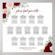 This beautiful 13 table wedding seating chart features a rustic boho chic design with hand painted watercolor roses in shades of burgundy, red, and blush pink, surrounded by eucalyptus leaves and garden greenery. The traditional arrangement has space for 130 names with 10 seats per table. The title is written in elegant script calligraphy, and there is space for the names of the couple and wedding date below. Wonderful way to add beauty and style to your reception while making it easy for your guests to find their seats.