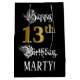 This opulent and elaborate birthday giftbag design features the message “Happy 13th Birthday,”, plus a custom recipient name. Part of the message is in an ornate script-style text, the large number “13th” features a faux/imitation gold-inspired look pattern, and the background is coloured black. An elegant birthday themed gift bag like this might be a respectable way to wrap a gift or present being given to celebrate somebody’s thirteenth birthday. [~Z0000560]