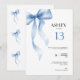 Make your teenager's special day even more memorable with our 13th birthday invitation featuring a beautiful blue bow design. This elegant and classy invitation is an editable template that you can personalise easily, making it perfect for a 13-year-old girl’s celebration party. With its minimalist style and charming watercolor coquette element, this invitation is not only visually appealing but also practical, allowing you to send a stylish blue ribbon invite with just a few clicks. Choose our printable card to ensure that every detail stands out as you invite friends and family to join in the festivities. Celebrate her journey into teenage years with a stunning invite.