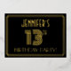 The front of this 1920s-1930s style inspired and vintage-appearance thirteenth birthday celebration foil invitation features a personalised name, a large art deco style inspired number “13TH”, the message “BIRTHDAY PARTY!”, and a border pattern consisting of lines. There is a black-coloured background on the front by default, but it can be customised to a different colour if desired. The back features personalised details about the event, such as the date, time, location, and any other information that may be relevant. Elegant, luxurious, customisable invitations like these might be used to invite guests to a birthday party/celebration being held to celebrate somebody’s 13th birthday. [~Z0000590]
