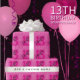 A modern mix of casual, script and serif typography in a fun combination of pinks makes a festive 13th birthday wrapping paper that you can customise for any name.