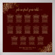 This beautiful wedding seating chart includes table assignments for 140 guests at 14 tables. The simple yet elegant design features gold text on a burgundy background with a lacy script calligraphy title. The corners are decorated with a frilly faux foil filigree with curls and swirls. Stylish, chic and sophisticated way to help your guests find their seats at your reception.