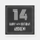 This 1920s/1930s style inspired birthday themed paper napkin design features a large Art Deco style inspired number "14", the message "HAPPY 14th BIRTHDAY,", a customisable name, and a border pattern consisting of lines. Birthday themed paper napkins like this might be used at a party celebrating somebody’s 14th birthday. [~Z0000395]