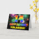 The front of this cheerful, fun, and colorful birthday greeting card design features a large number "14" and the message "HAPPY BIRTHDAY,", both having a rainbow spectrum gradient inspired pattern coloring, along with a bold yellow customizable recipient name. The front also features a multicolored background pattern inspired by bursting celebratory fireworks. The inside features a customized birthday greeting message, or could perhaps be cleared and left blank if a message is to be written by hand instead. A colorful personalized birthday card like this might be a fun way to send a message celebrating somebody’s fourteenth birthday. [~Z0000471]