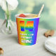 This fun and joyful birthday-themed paper cup design features a large number “14” having a colourful rainbow spectrum inspired gradient pattern. It also features the message “HAPPY 14th BIRTHDAY,”, and a custom name. The background also features a cheerful multicolored rainbow spectrum inspired gradient pattern. Paper cups like this might be used when celebrating somebody’s fourteenth birthday. [~Z0000576]