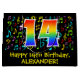 This fun, vibrant, and colourful birthday themed gift bag design features a large number "14" with a rainbow spectrum gradient inspired pattern, along with the message "Happy 14th Birthday,", and a customisable name. Part of the background has a pattern of various music notes and symbols having a variety of colours and sizes. A birthday themed giftbag like this might be a fun way to wrap a gift or present being given to a singer, a musician, a music composer, or somebody else who is celebrating their 14th birthday. [~Z0000425]