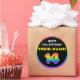 This joyful and upbeat birthday-themed round sticker design features a large number “14“ with a colourful rainbow spectrum inspired gradient pattern, along with the message “HAPPY 14th BIRTHDAY,”, and an editable recipient name. Cheerful birthday themed stickers like these might be used or given out at a birthday party for somebody who is celebrating their fourteenth birthday, or perhaps used when preparing presents or invitations for such an event. [~Z0000637]