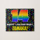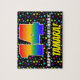 This fun and bold birthday-themed jigsaw puzzle design features a large number “14” having a multicolored rainbow spectrum inspired gradient pattern. It also features the message “HAPPY 14th BIRTHDAY,”, and a custom recipient name. The background features a cheerful, multicolored pattern featuring star shapes of various sizes. A vibrant, customisable birthday puzzle like this might be a fun way to send a birthday greeting message to somebody who is celebrating their fourteenth birthday. [~Z0000607]