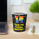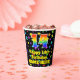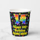 This exciting and joyful birthday themed paper cup design features a large number “14” with a rainbow spectrum gradient inspired pattern, along with the message “Happy 14th Birthday,”, and a customisable name. The background features a colourful pattern featuring many star shapes with different colours and sizes. Vibrant, colourful paper cups like this might be fun to use at a birthday party/celebration being held in celebration of somebody’s 14th birthday. [~Z0000540]