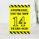 The front of this fun and bold birthday-themed greeting card design features an editable name and the message "YOU’RE NOW 14 YEARS OLD!" in black stencil inspired text on a yellow colored background. There is also an eye-catching black and yellow stripes pattern at the top and bottom edges of the front. The inside features an editable birthday greeting message, or could perhaps be cleared and left blank if a message is to be written by hand instead. A customizable birthday card like this might be a fun way to acknowledge somebody’s fourteenth birthday. [~Z0000413]
