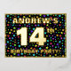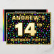 The front of this fun fourteenth birthday party/celebration foil invitation card design features a personalised name, a large number “14th”, the message “BIRTHDAY PARTY!”, and a border. The background of the front has a joyful, colourful star shapes pattern. The back features personalised details about the event, such as the date, time, location, and any other relevant information. Personalised invitations like these might be a fun way to invite attendees to a birthday gathering/party being held to honour somebody’s 14th birthday. [~Z0000600]