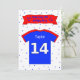 This colourful party invitation is ideal for both boys' and girls' parties. On the front there is a blue and red sports-style shirt, with a large white number 14 - personalise it with a name. On the reverse of the card there are lots of lines for details of the party, just type in the boxes.