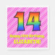 This cheerful and happy 14th birthday-themed paper napkin design features a large number "14" having a colourful pattern inspired by the look of a rainbow spectrum. It also features the message "Happy 14th Birthday,", followed by a custom name. The background features a cheerful pattern of light pink and dark pink stripes containing loving pink heart shapes. Birthday themed paper napkins like this might be fun to use at a celebration being held to honour somebody who is celebrating their fourteenth birthday. [~Z0000417]