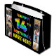 This joyful and eye-catching birthday-themed gift bag design features the message “HAPPY 14TH BIRTHDAY,“ with the text having a multicolor rainbow spectrum inspired gradient pattern, along with a customisable recipient name. To the left and the right of the rainbow-patterned message on the front are some photos that can be personalised, perhaps with photos of the recipient, the recipient’s family and friends, and/or the sender(s) of the gift. A cheerful gift bag like this might be a fun way of wrapping a birthday gift being given to somebody who is celebrating their fourteenth birthday. (Photography © Storytree Studios, Stanford, CA.) [~Z0000668]