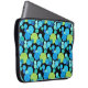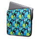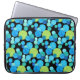 A vibrantly coloured sleeve to protect your laptop (15" or smaller), with a 'Blue Moons' abstract pattern in bright blues and neon green on a black background; from a handpainted paper collage design by Judy Adamson.