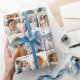 Use 15 photos to create a personal photo collage wrapping paper. This modern, clean layout includes both square and vertical photos.. The background colour and fonts can be changed in the customise area.