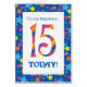 A bright and colourful 15th Birthday Card for a Nephew, with striped numbers and a starry border, from a digital design by Judy Adamson. You can change the inside message if you wish.