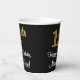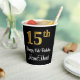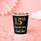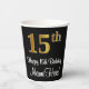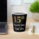 This sophisticated, elegant, and luxurious birthday-themed paper cup design features a large ordinal number “15th” having a faux/imitation gold-like look, in addition to the birthday greeting message “Happy 15th Birthday,” and an editable name in a script-style font. The background is coloured black. Sophisticated paper cups like this might be used when hosting a party for somebody in celebration of their fifteenth birthday. [~Z0000538]