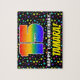 This upbeat and bold birthday themed jigsaw puzzle design features a large number “15” having a multicolored rainbow spectrum inspired gradient pattern. It also features the message “HAPPY 15th BIRTHDAY,”, and a custom recipient name. The background features a joyful, multicolored stars pattern. A fun, customised birthday puzzle like this might be used to celebrate somebody’s fifteenth birthday. [~Z0000607]