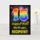 The front of this colourful, fun, and exciting birthday greeting card design features a large number "15" with a rainbow spectrum gradient inspired pattern, along with the message "Happy 15th Birthday,", and a personalised recipient name. The front additionally has a colourful bursting celebratory fireworks inspired background pattern. The inside features a customisable birthday greeting message, or could perhaps be cleared and left blank if a message is to be written by hand instead. A customisable birthday card like this might be a fun way to celebrate somebody’s fifteenth birthday. [~Z0000442]