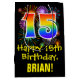 This colourful, fun, and exciting birthday gift bag design features a large number "15" with a rainbow spectrum gradient inspired pattern, along with the message "Happy 15th Birthday,", and an editable recipient name. It also has a colourful background pattern inspired by the appearance of bursting celebratory fireworks. A birthday themed gift bag like this might be a fun way to wrap a gift or present being given to celebrate somebody’s fifteenth birthday. [~Z0000509]