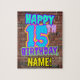 This fun birthday-themed puzzle design features the message “HAPPY 15TH BIRTHDAY,” having a colourful, vibrant, graffiti-inspired appearance, plus an editable recipient name. The background features a pattern inspired by the look of a brick wall. A fun, personalised birthday puzzle like this might be a fun way to deliver a birthday greeting message to somebody who is celebrating their fifteenth birthday. [~Z0000532]