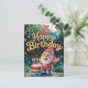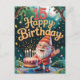 A vibrant and joyful digital birthday card illustration featuring a friendly gnome celebrating a 15th birthday. The gnome, with a full white beard and a red-and-yellow striped party hat, stands behind a two-tier chocolate and strawberry cake adorned with four lit candles. The top of the card features the number "15" in large red 3D text above a bubbly "Happy Birthday" script. Set in a magical forest at night, the scene is filled with falling confetti, colorful candies, and glowing stars, creating a festive and enchanted atmosphere.
