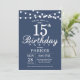 15th Birthday Invitation with String Lights. Blue Background. Kids Birthday. Boy or Girl Lady Elegant bday Invite. 13th 15th 16th 18th 20th 21st 30th 40th 50th 60th 70th 80th 90th 100th, Any age. For further customisation, please click the "Customise it" button and use our design tool to modify this template.
