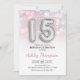 15th birthday party invitation. Elegant design in faux glitter silver with pastel pink and purple lights. Invite card features silver number 15 balloons and script font. Perfect for a stylish bday celebration. Message me if you need custom age.