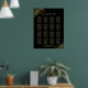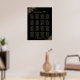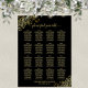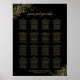 This beautiful wedding seating chart includes table assignments for 160 guests, with 10 people at each table. The design is simple yet elegant with gold text on a black background and features lacy gold faux foil filigree in the corners with fancy script calligraphy reading "please find your table." Sophisticated and chic.