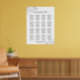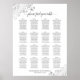 This beautiful wedding seating chart includes table assignments for 160 guests, with 10 people at each table. The design is simple yet elegant with dark grey text on a white background and features lacy silver faux foil filigree in the corners with fancy script calligraphy reading "please find your table." Sophisticated and chic.