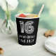 This vintage appearance and Roaring Twenties inspired birthday-themed paper cup design features a large art deco inspired look number “16”, in addition to the birthday greeting message “Happy 16th Birthday,” and an editable name. The background is coloured black. Paper cups like this might be used when celebrating somebody’s sixteenth birthday. [~Z0000542]