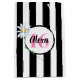 White daisy on black and white striped pattern with name and age for 16th birthday.
