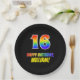This cheerful, fun, and colourful birthday paper plate design features a large number "16" and the message "HAPPY BIRTHDAY,", both coloured with a rainbow spectrum gradient inspired pattern, along with a bold yellow custom name. It has a black coloured background. Birthday themed paper plates like this might be fun to use at a celebration being held to honour somebody who is celebrating their sixteenth birthday. [~Z0000488]